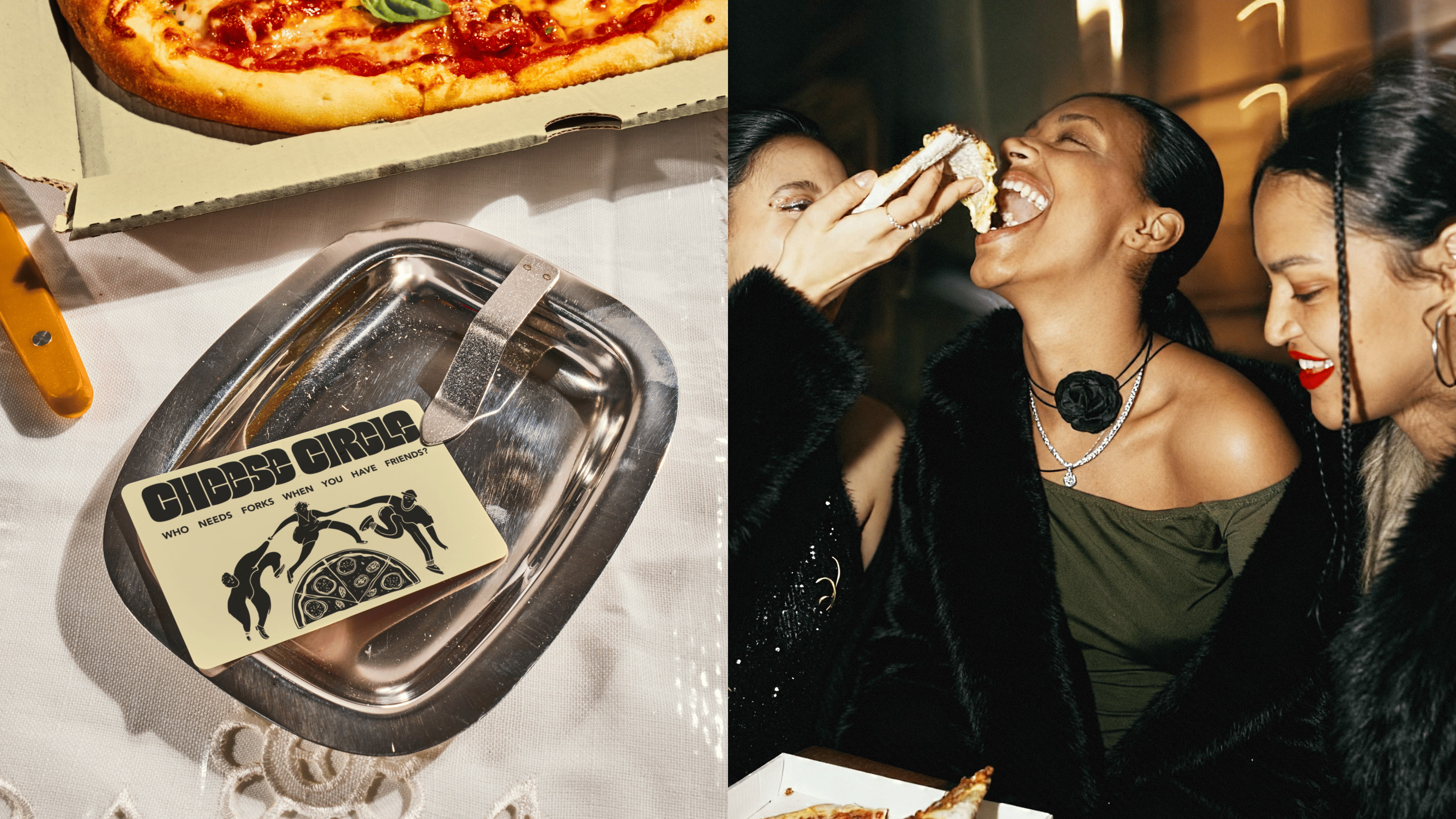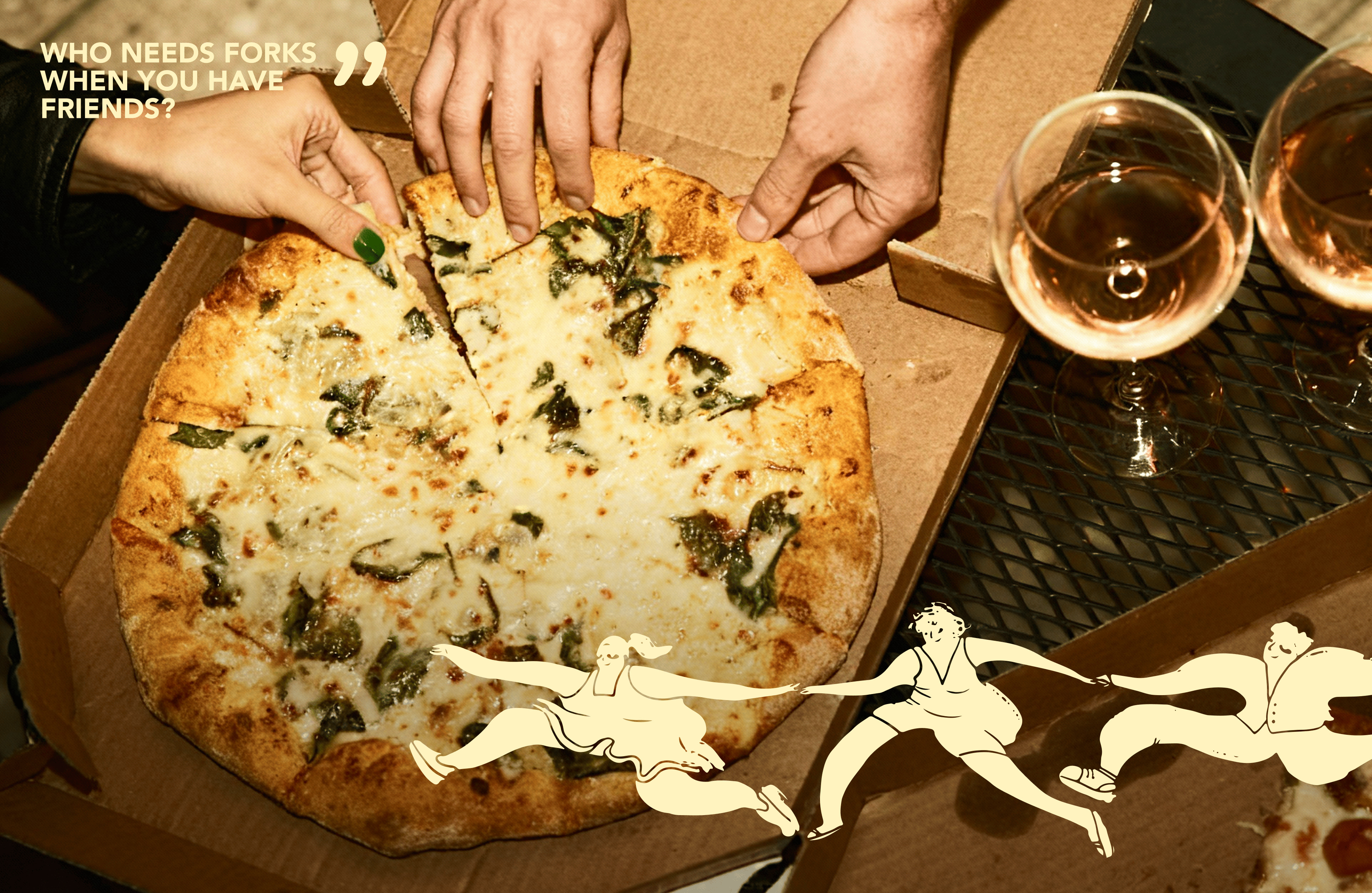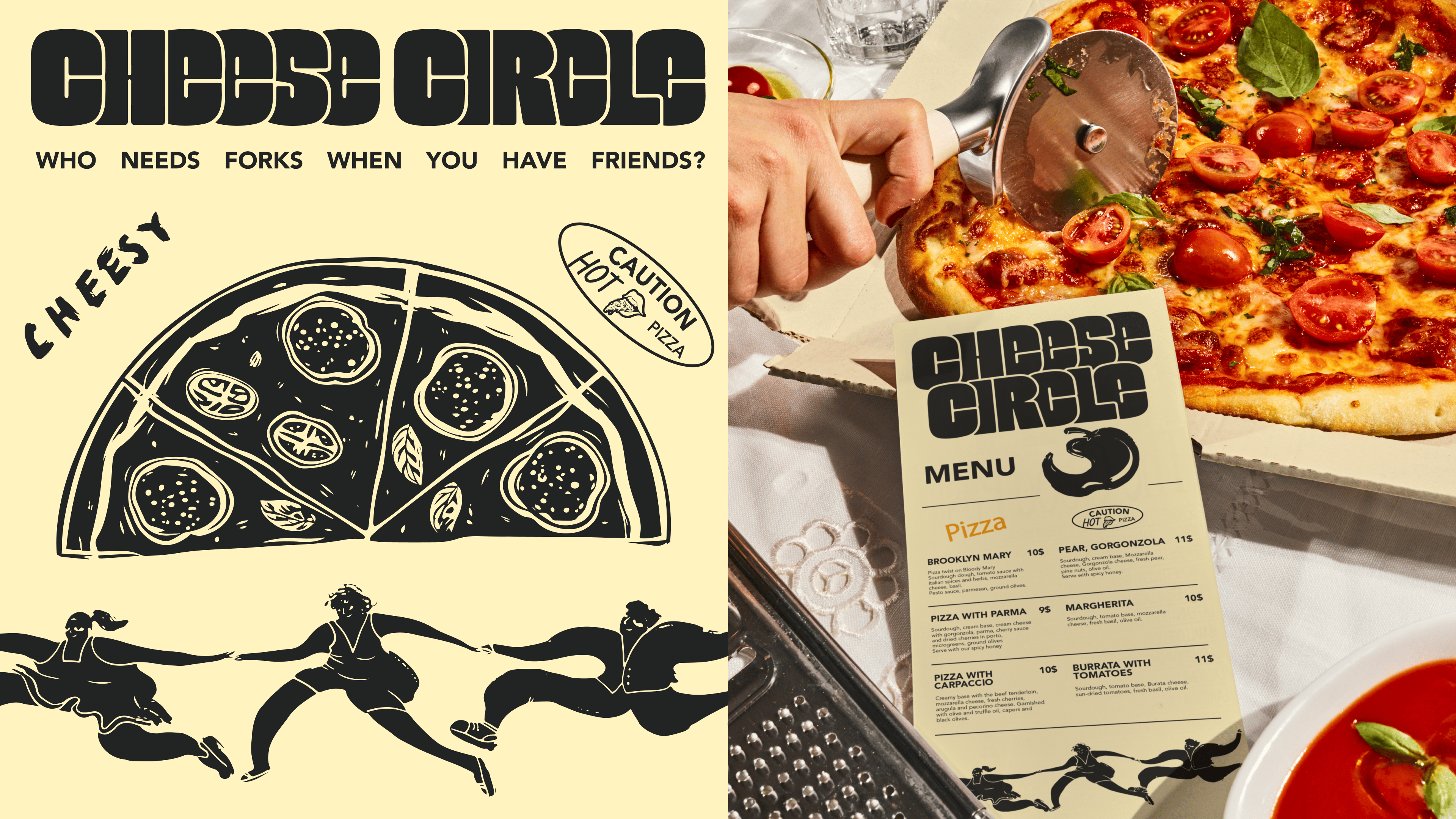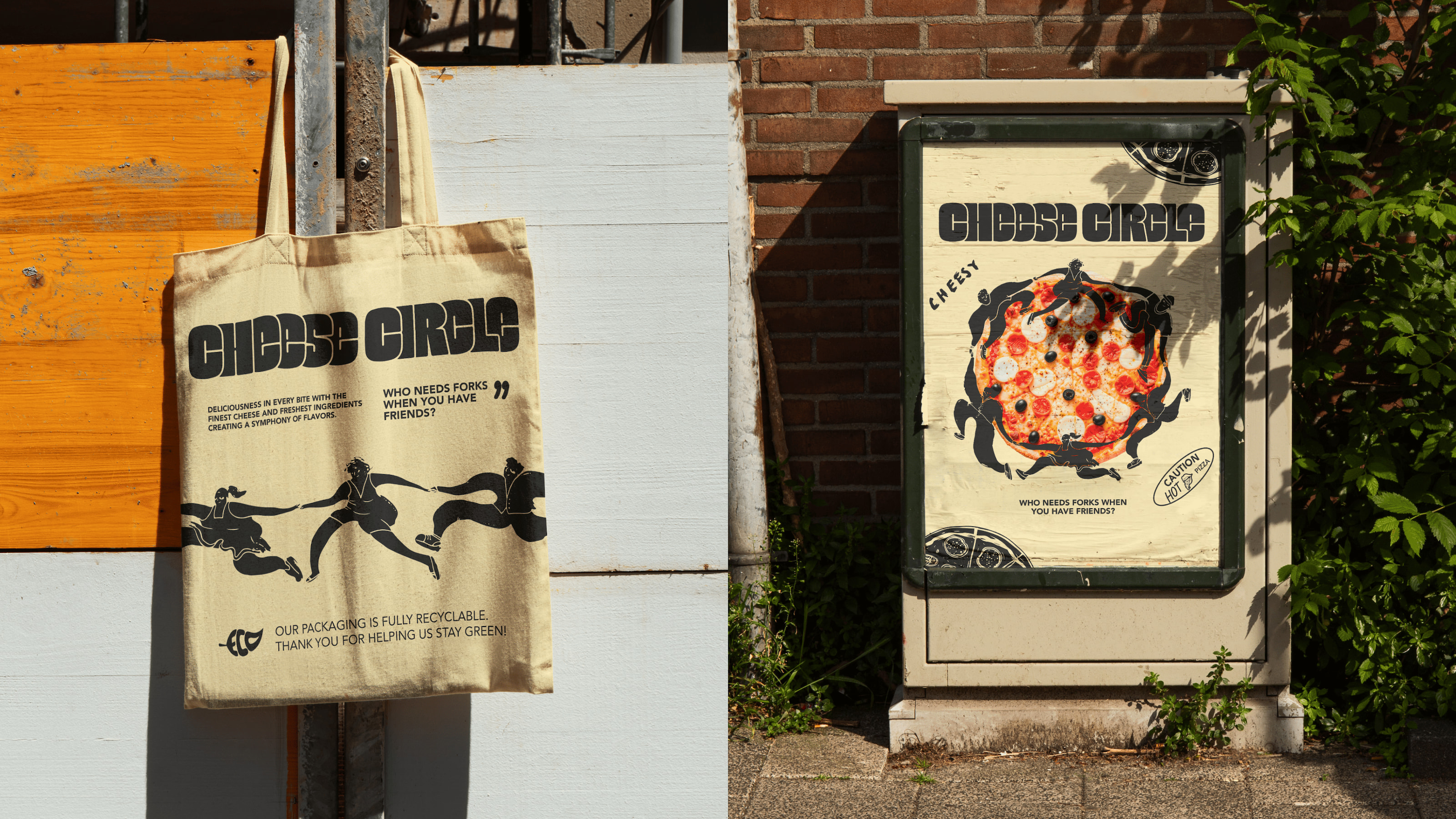 We crafted a vibrant and playful brand identity that radiates modern charm and warmth. At its core is a lively illustration of a pizza slice encircled by people, capturing the joy of gathering and sharing moments together. A fresh color palette of black, orange, green, and off-white adds vibrancy and versatility, ensuring every brand element—from takeaway boxes to signage—is instantly recognizable. By blending creativity with approachability, the identity perfectly encapsulates the brand’s essence with the playful tagline: “Who needs forks when you have friends?”